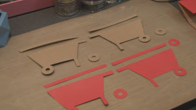 | Adhere the centre piece of the wheelbarrow to the back of one of the wheelbarrow shapes. |